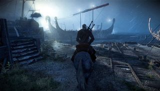 The Witcher 3's dynamic weather system has conjured up a storm at this point. Wind lashes the trees of the surrounding forest. Every branch whips in the wind, and the tall grass is caught in flurries. Weather will affect monster behaviour – just as certain beasts will only come out at night – but it also looks terrific. When Geralt meditates, the world goes into timelapse. The spinning sky, shifting light and skittering shadows show off the new engine's considerable abilities. The Witcher 3 is exceptionally pretty.