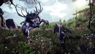 The hands-off demo I saw was being controlled by CD Projekt Red. For the first time in the series, the game lets players potter about an open world full of incidental missions like this. The devs could just as easily steer Geralt elsewhere and go exploring, but they opt to side with the youngster and venture into the woods, using Geralt's 'Witcher sense' to find the monster. A dull red haze highlights important clues in the environment, some scratch marks here, some tracks there. Geralt soon concludes that the boogeyman is a Leshen – a spooky, antlered humanoid of great power.