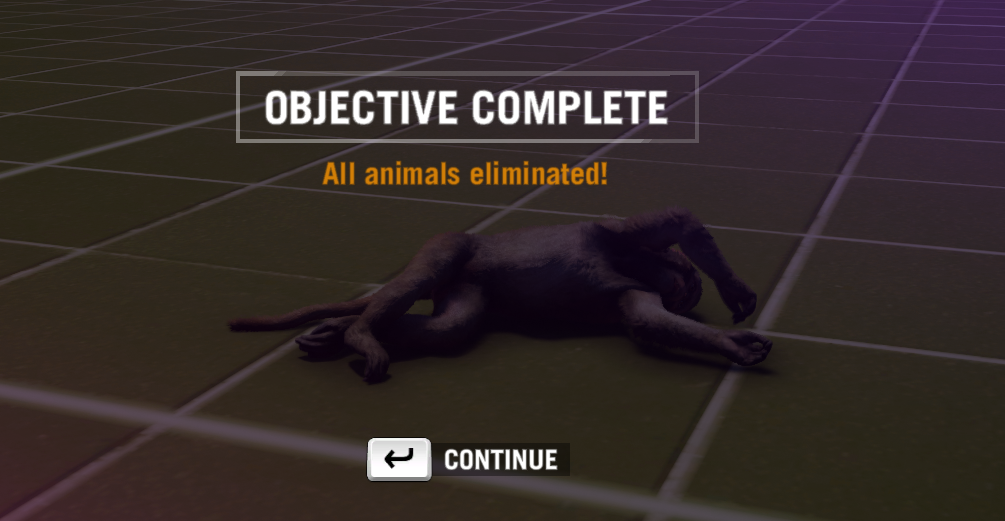 A small patch of land and trees on an otherwise untextured map. A long trail of weapons, presumably to test. A single human NPC standing nearby glumly informs me he's tired of eating beets and roots. There's also a monkey running around. I kill it in a successful test of one of the weapons. The game crash-zooms in to show me what I've done.
