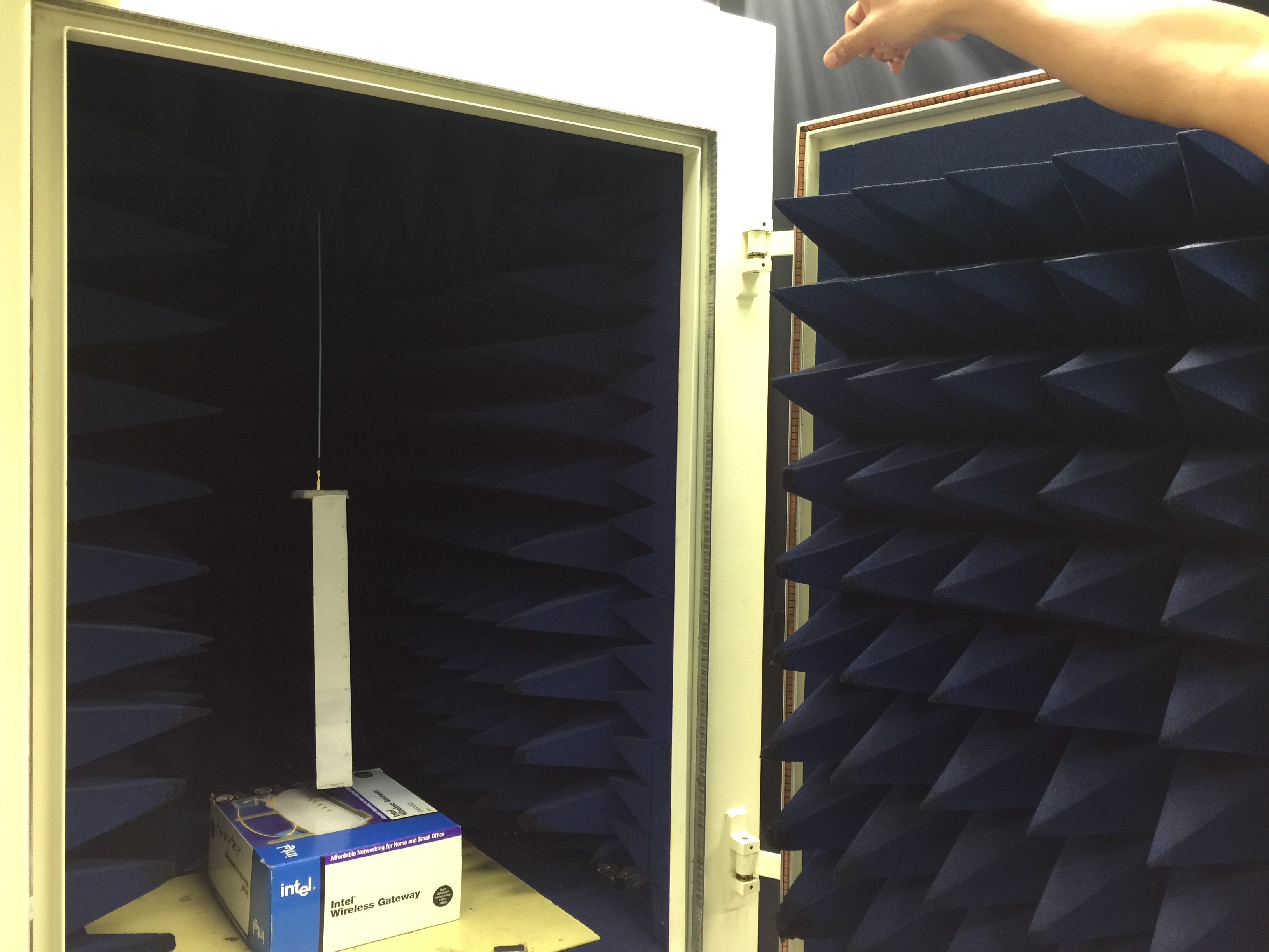 Here's one of MSI's many anechoic chambers. This one in particular plays hosts to testing of wireless devices. The room is completely void of outside radio frequencies. Step into here, and the signal on your mobile phone drops off completely. If you're ever stuck in here, there's no chance of dialing for help.