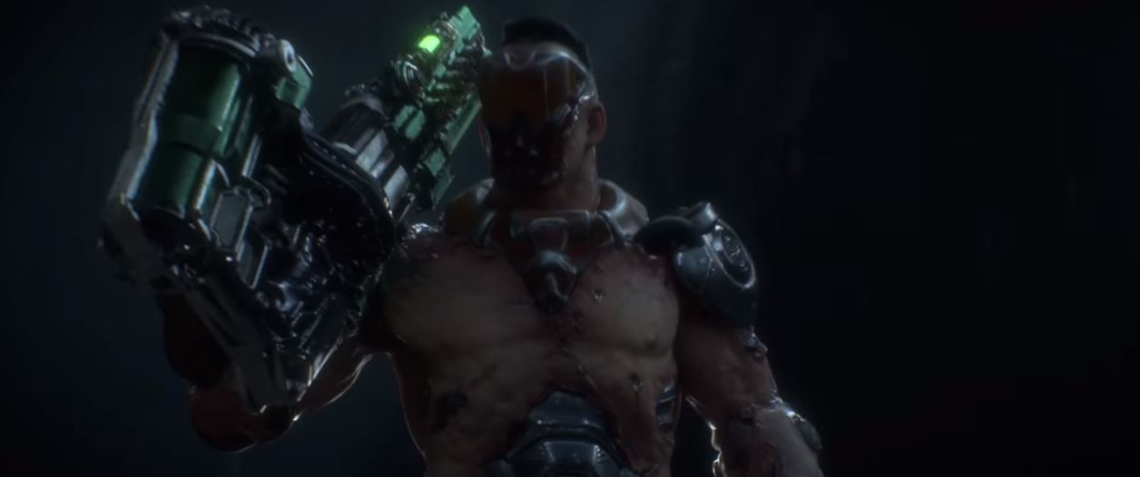 In the post-show stream, id Software’s Tim Willits dropped the names of the four characters in the trailer, and first up is Ranger, the main character from the original Quake. Whether or not he’s still voiced by Trent Reznor is up in the air. Here, we see him going up against a new character, ScaleBear (if I heard Willits correctly) who we’ll get to in a minute.