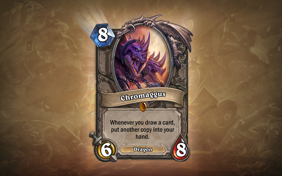 Tom: Chromaggus has huge potential, but only in certain decks. Its ability is really powerful, but 8 mana for a 6/8 body means you have to guarantee at least one card draw or it’s just not worth it, as it will probably be killed in an instant. Priest’s Power Word: Shield comes to mind as a good combo, allowing you to play a 6/10 and draw two cards on turn nine—or on turn seven, assuming you played Emperor Thaurissan on turn six and HOO BOY DO YOU LOVE THAT CARD YET? Priest already looks strong for Dragons, but the best combo is for Paladin: Play Dragon Consort to lower Chromaggus’s cost, then trade a few minions and play Solemn Vigil on the same turn. Tricky to pull off, sure, but potentially hilariously powerful.