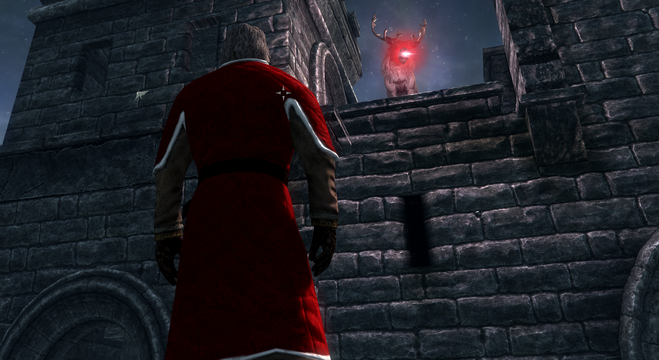 I've hated Falkreath even before tonight: it sports a confusing multi-level layout that makes it hard to find doors that you can see on the map. Now I've also come to hate its easily-angered residents. Still, by 8:52, we're out of there, having either visited everyone or perhaps gotten sick of trying to visit everyone while surrounded by angry guards and wizards. Rudolph is having major problems by this point, crashing to earth every few seconds while in flight, meaning we're constantly being attacked on the ground by Forsworn, bandits, wolves, and sabre cats. No one seems happy to see Santa tonight!