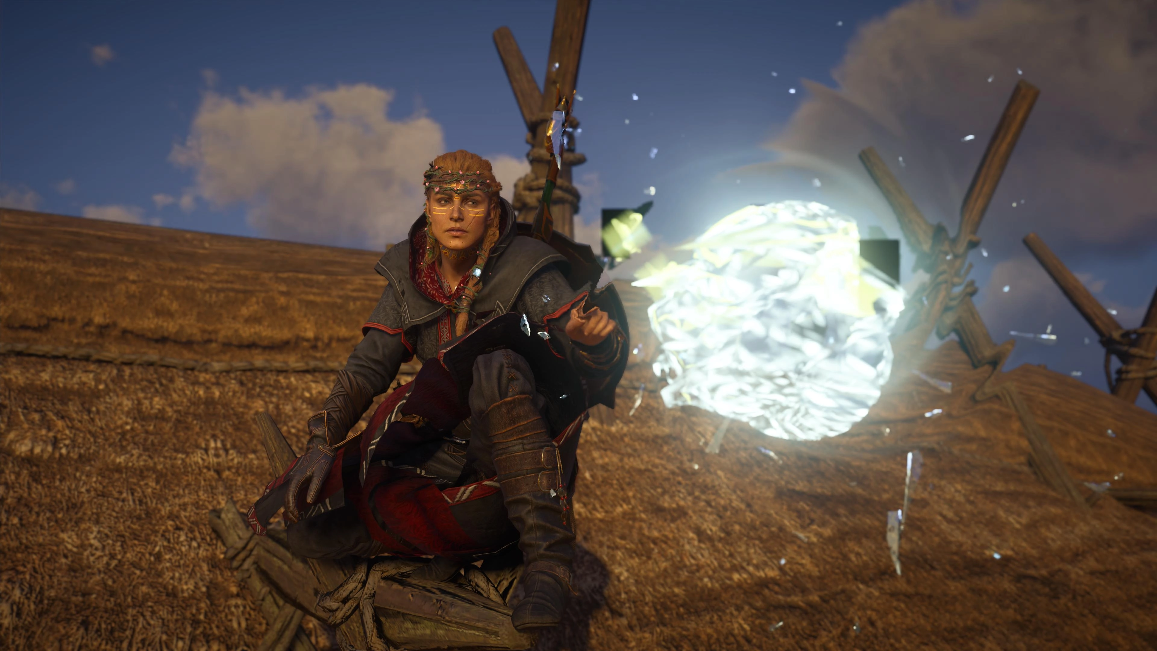Run around the camp for a while and sit next to the fire, where Eivor and Basim will give each other a nod, then return to the Animus. As you spawn back in Ravensthorpe, you'll get the second set of armour: the Jarl of the Raven clan set which comes with big feathers and looks rad.
