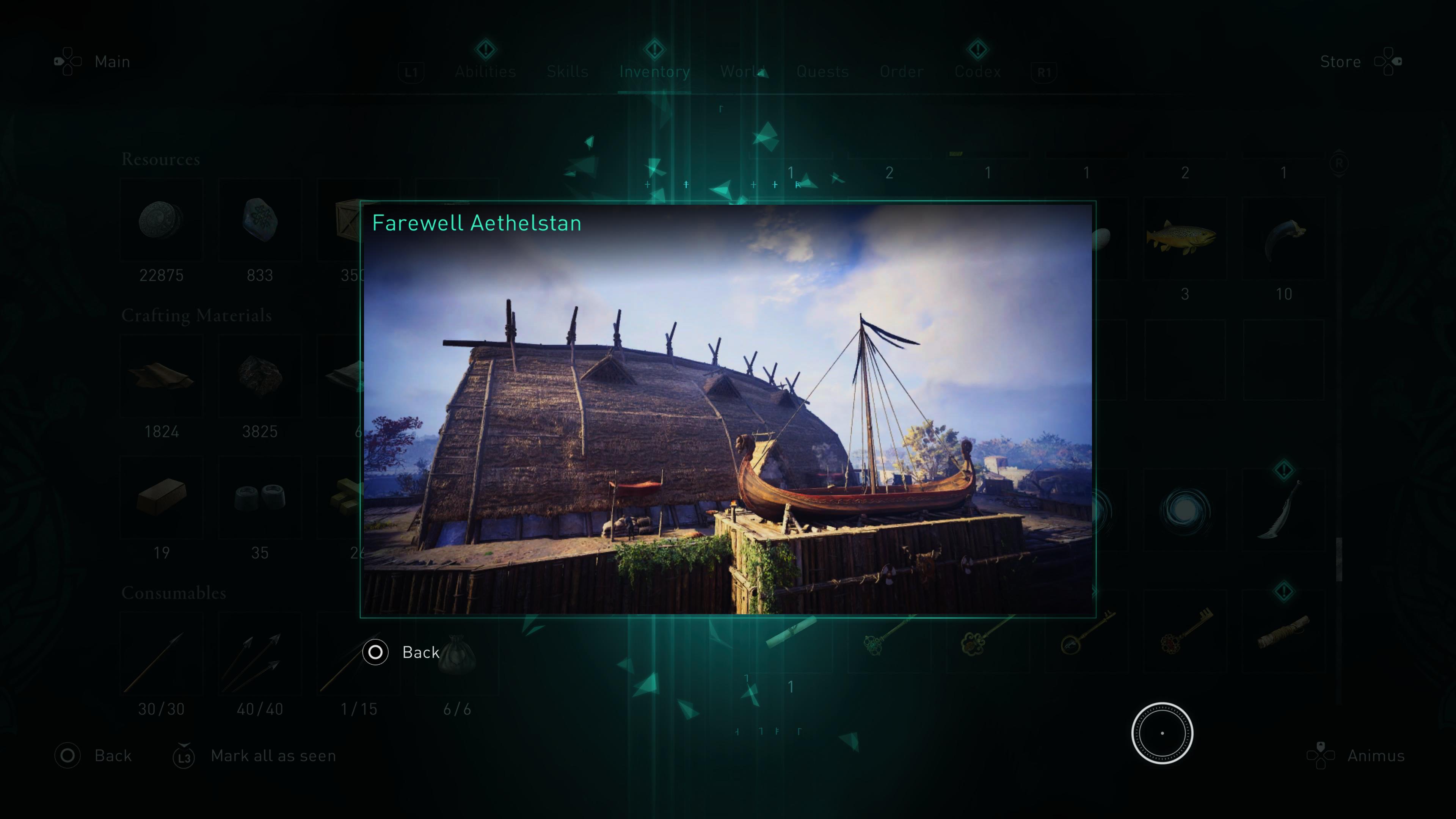 After a brief but challenging encounter with Roshan, it's back to Ravensthorpe, specifically a log across the water that gives you a nice view of your homestead. Odin will sit beside you and Eivor will declare that she's ready to explore why it is she has Odin with her, this second hugr, which means sailing west solo for reasons. You'll get a bunch of memories in your inventory that will show you locations of people she wants to say bye to, and you can track them via the Quest menu.