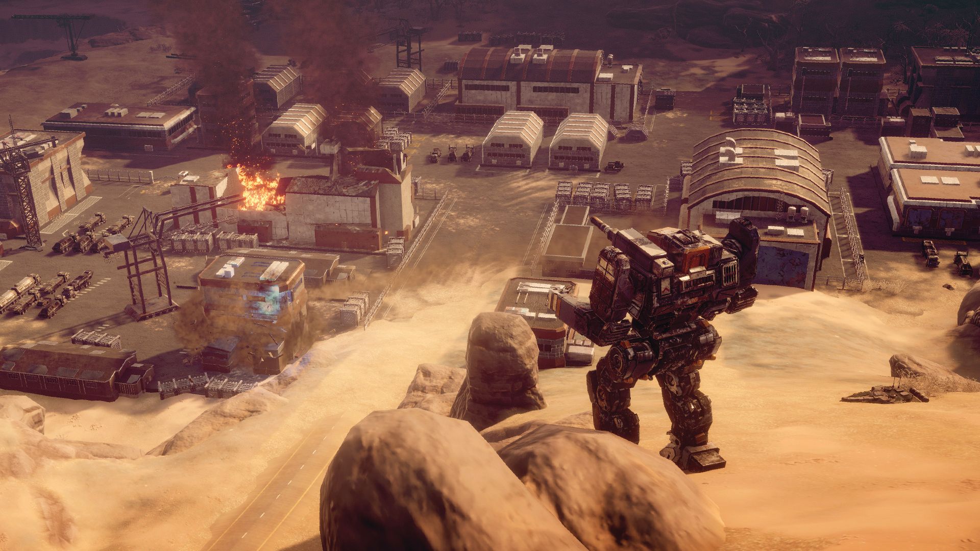 Dekker has fallen over. His 30-metre-tall mech is prone at a desert crossroads, flanked on two sides by canyon walls that do not—it turns out—prevent him from being shelled by artillery. I’d sent him in because his mech is the most armoured: his job was to tie up enemy firepower while my quicker mechs flanked through a lowland forest to the south.