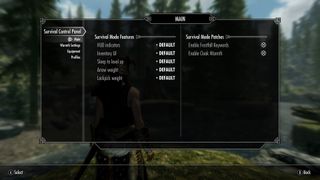 If you do want to stick with the Creation Club survival mode, perhaps because you got it as part of the Anniversary Edition, this control panel will let you change how it works. You can turn on and off options like whether you need to sleep to level up, as well as modifying the warmth rating of clothes, including cloaks if you've got a mod that adds those.