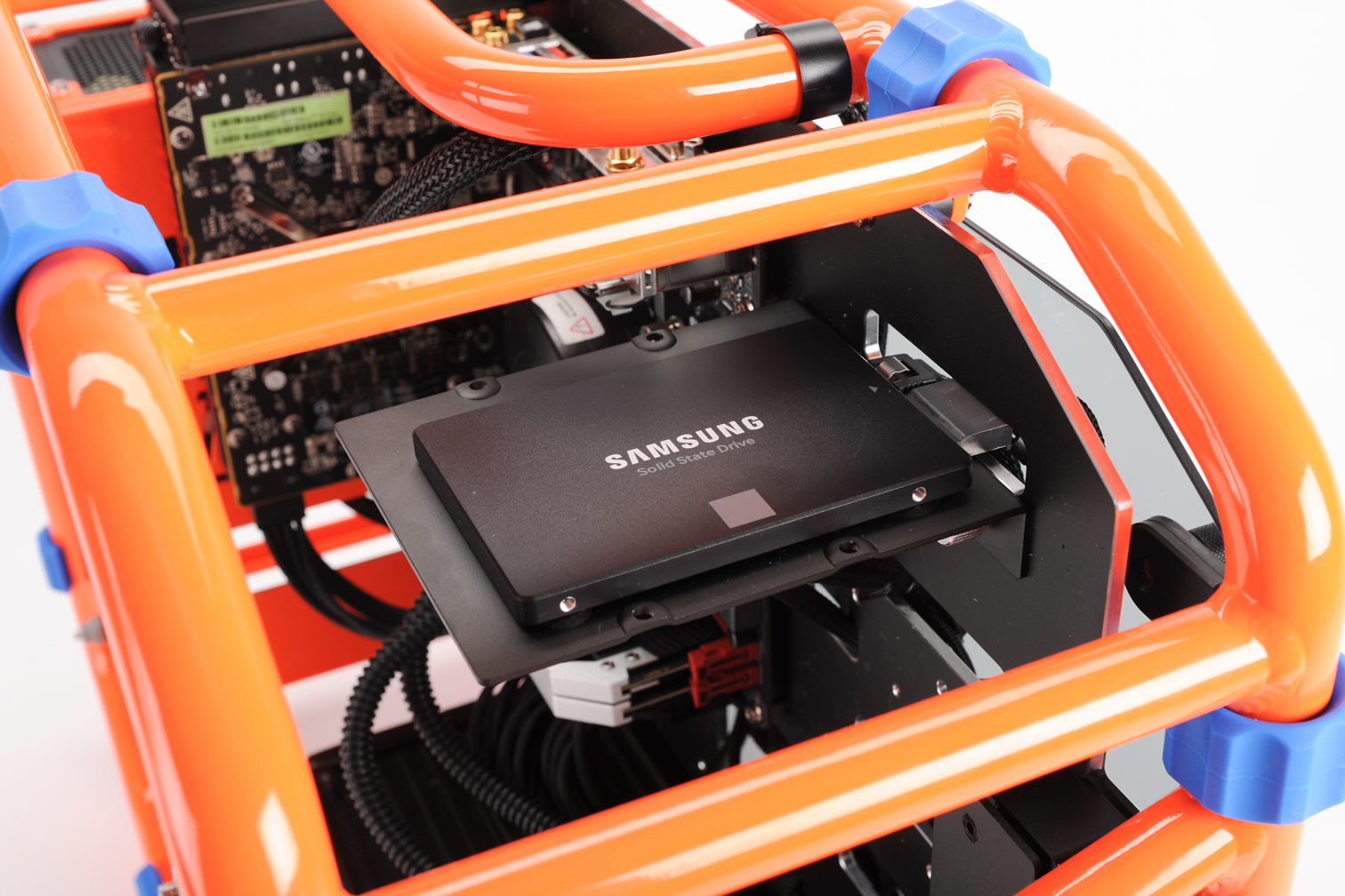 Another thing we noticed was the black finish on the 850 EVO is very similar to the finish of the aluminum mount of the D-Frame. This makes the slim little SSD seem to disappear, until you look from the top and see the Samsung label on its face. The one downside to this mount was that the drive is just a little too far from the edge of the plate (about two or three millimeters), which made it a little hairy when we tried using an L-shaped SATA cable.