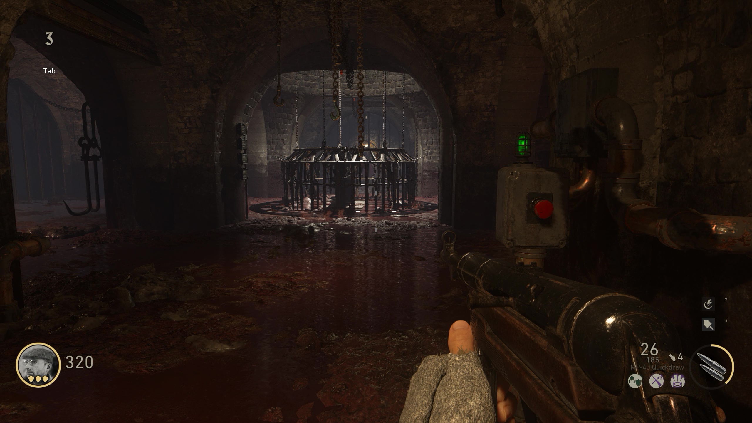 Drop back into the Tunnel after bringing both generators to life and opening the Bunker door. If you're facing the Blitz machine, turn around to meet the Sewer gate right in front of you. Pay the 1,250 Jolts and follow the sloping path all the way to the bottom, passing by a second gate and a Geistchild stand in an alcove. You can't miss the large cage guarding your final prize in the middle of this pillar-filled room. Move across to an MP40 weapon locker against the far wall, and turn to face the cage. Find the button sitting beside the pillar closest to the locker. Press it, and the cage will rise a few feet and screech to a halt.