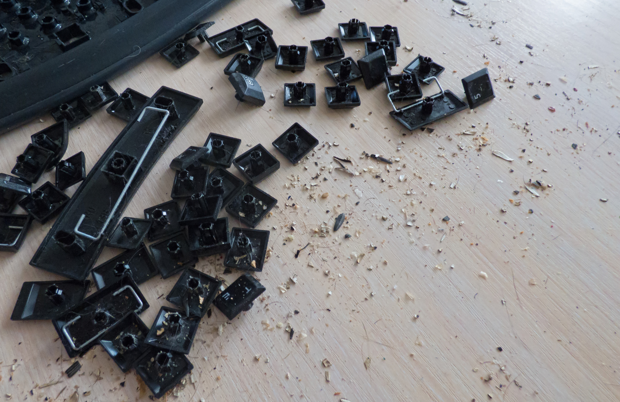 Start by holding that plank over the trash can, or off the balcony if you like to live dangerously, and flip it upside down. Give it a good shake to dislodge all the hair and bits of food and dust that snuck their way between the keys. Make sure to let out a good "Ewww" if some really nasty pieces drop out. It's cathartic!