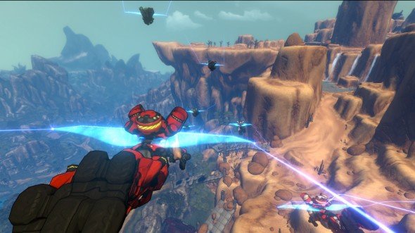 It's a team-based shooter, a mash-up of FPS and MMO that wowed us when we first glimpsed it : mercenaries strapped into jetpacks, hopping in teams across a beautiful, cartoonishly bright landscape. It's all the better for knowing that you can be simply called to action by the server, bundle into a giant ship and head off to another part of the world – where a boss might be stomping all over a human village.
