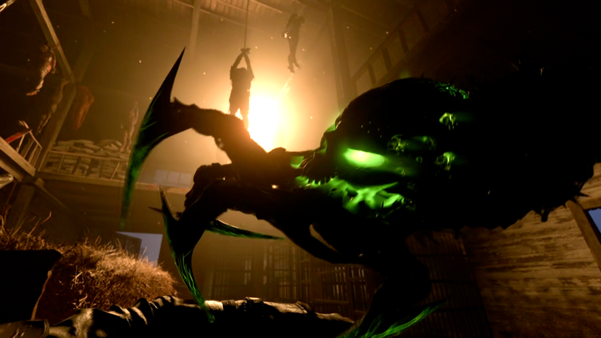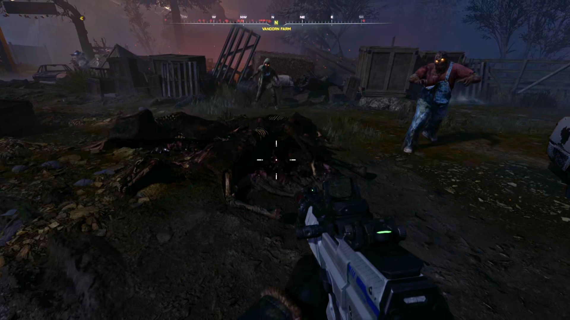 Head inside the barn and check the bodies hanging from the ceiling. One of the zombies suspended in the middle of the room is dripping blood from its leg. Throw a Combat Axe at the leg to sever its foot, then burn the fallen foot with a Molotov to get the Human Bones.