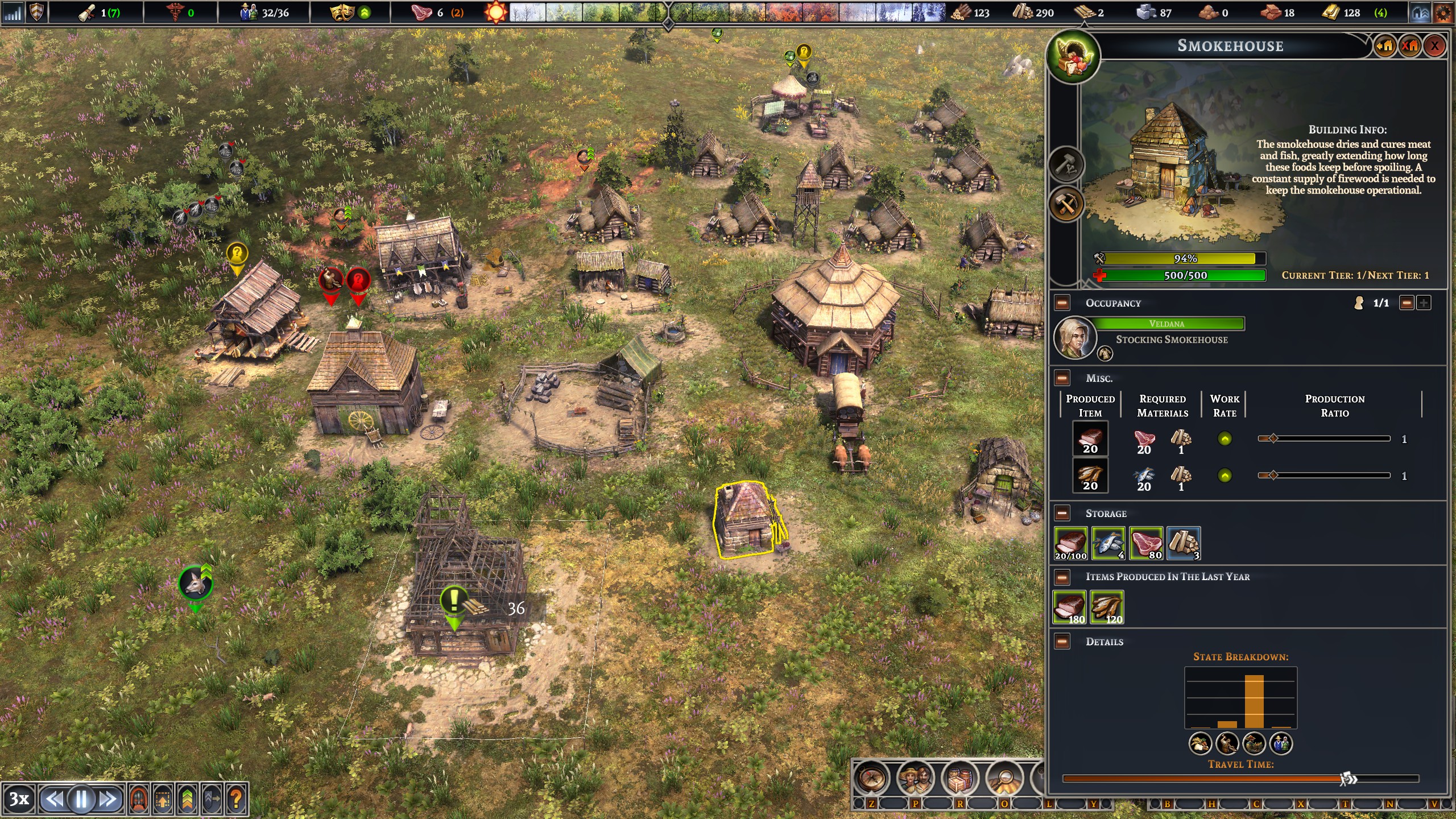 You can watch those production chains in real time because all those resources and products exist in the world, not just as numbers in a ledger. Got a merchant at your trading post interested in buying smoked fish?