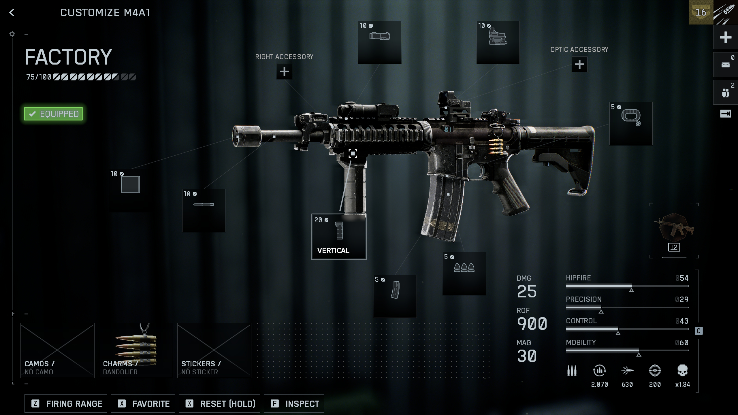 The M4A1 is an absolute bullet hose with a 900RPM fire rate, so this comes with quite the kick. The Double-Port Brake muzzle and Alloy Vertical grip are your best options to reduce this recoil to a more than controllable level, without killing your accuracy in the process. You unlock the Double-Port Brake at Mastery 15, so I suggest using the Single-Port Brake or Convertor until you've got it, since these are effectively weaker versions.