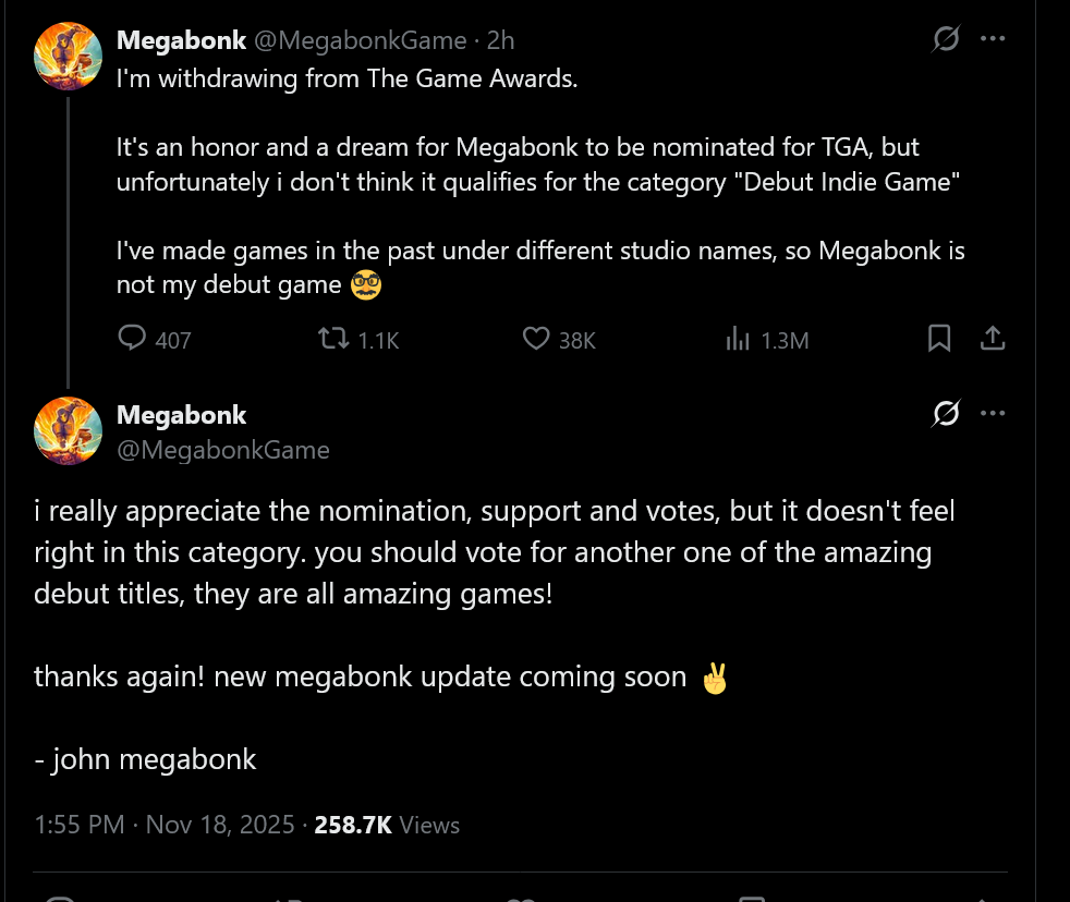 "We’re grateful for his honesty," Keighley wrote. "As a result, MegaBonk will be removed from the category."