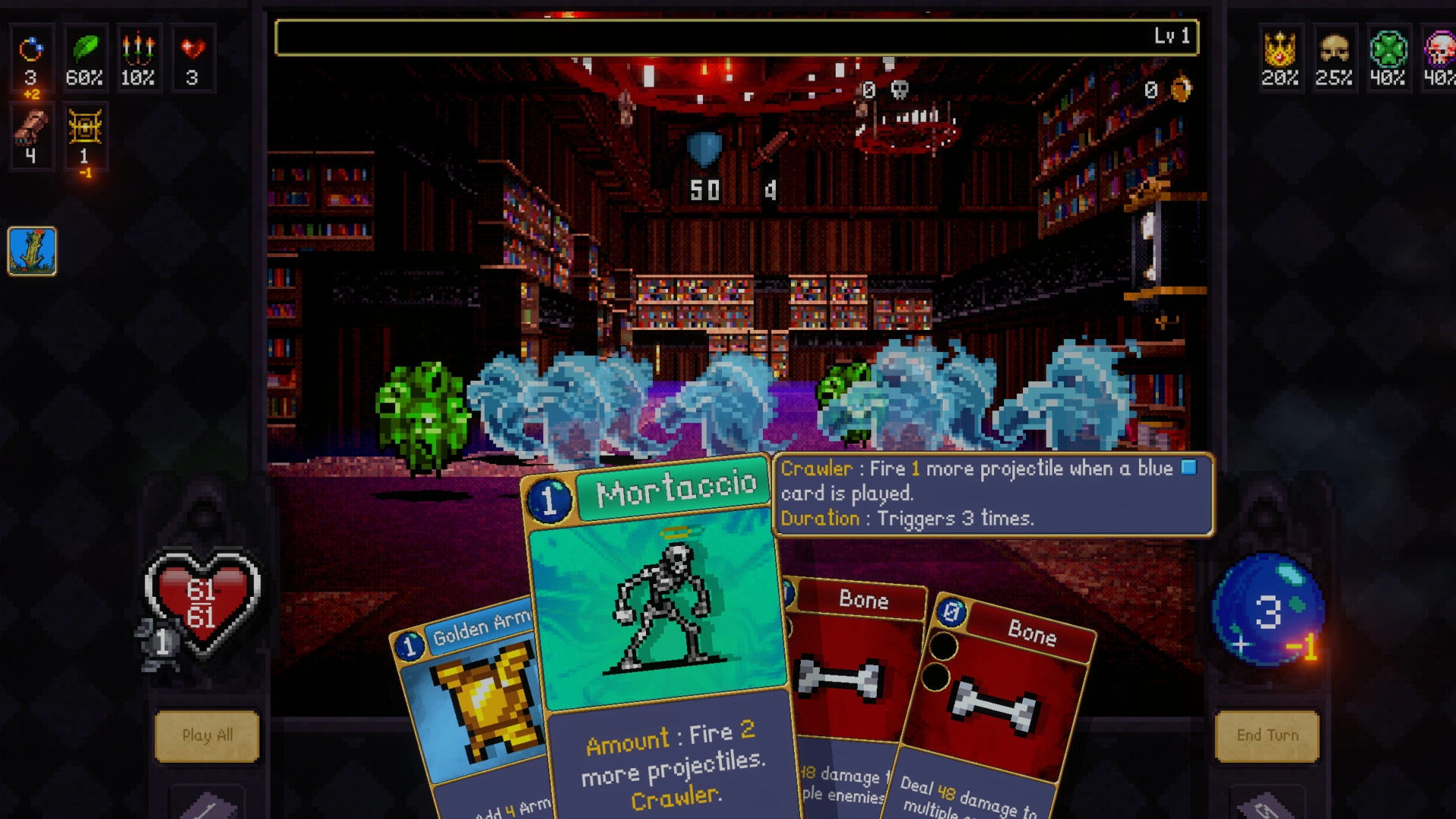 With Mortaccio active, you'll add even more Bones to the pile every time you apply armor. Bones cost 0 mana, and they can combo with Golden Armor to seriously strengthen your defenses. Add in some Duplicator cards—which also combo with Bones—and you'll crush anything in your path with a cascade of calcium.