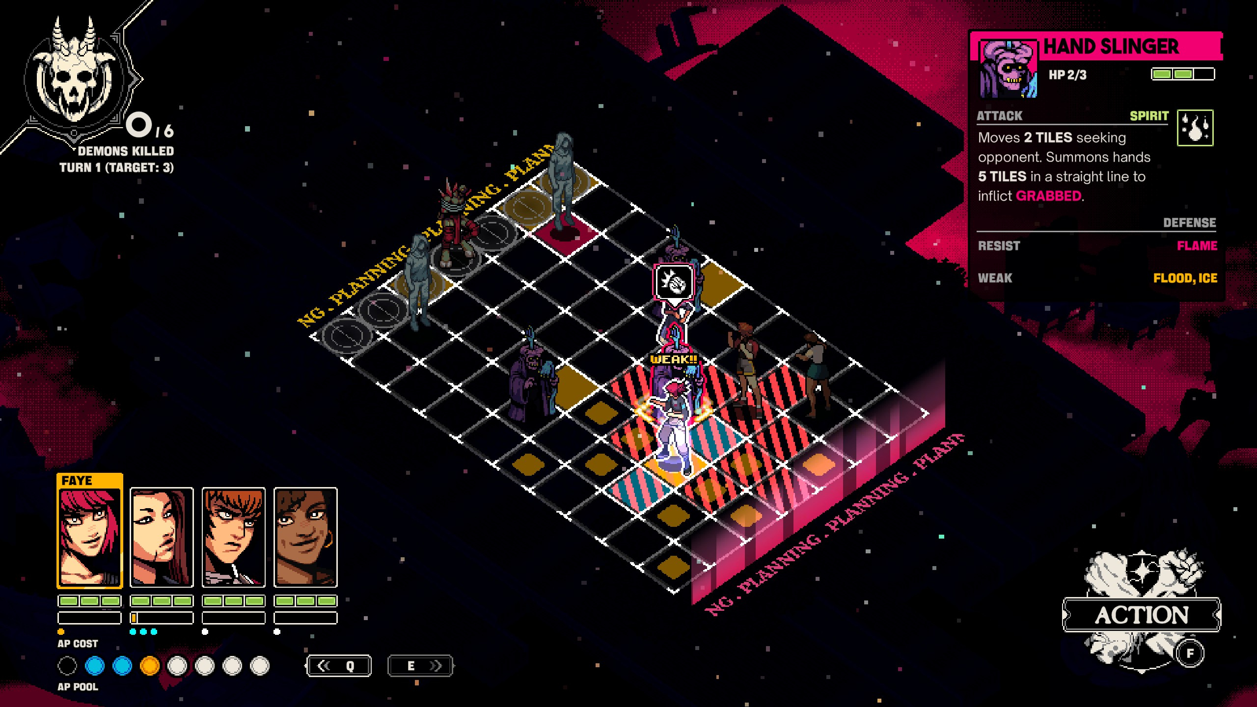 The real beauty of Demonschool's battle system is the way it's divided up into the planning and action phase. The former almost feels like I'm cheating at chess, manoeuvring step-by-step to see the consequences of my actions before they happen. I can undo moves, shuffling and sidestepping until I've kicked and punched as much demon scum as I can. Once I've strategised to my liking I can hit the button and watch the entire thing play out at once, like winding up a toy car and then letting it rip along the laminate.