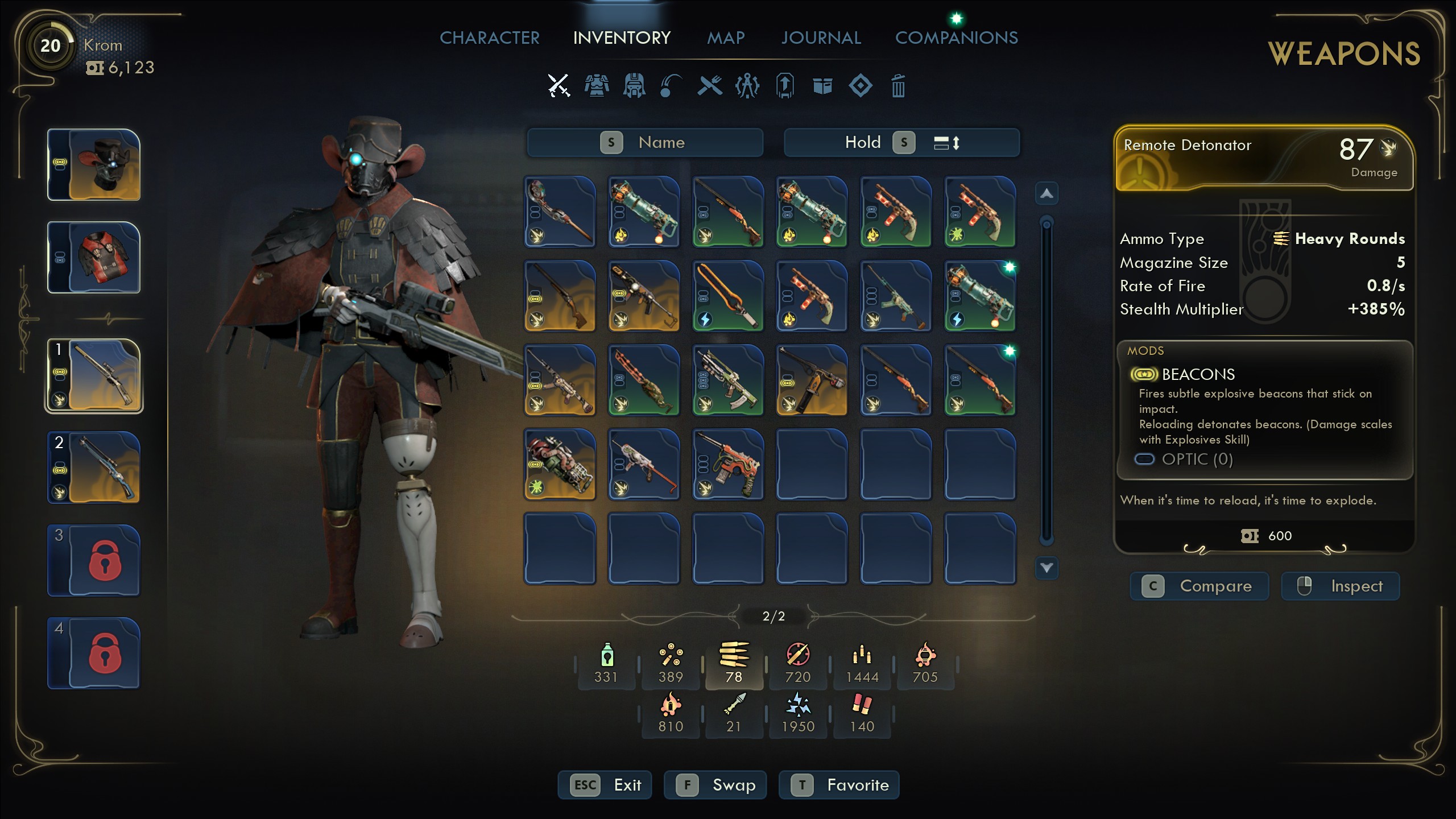 - Beacons: Fires subtle explosive beacons that stick on impact. Reloading detonates beacons (damage scales with explosives skill)