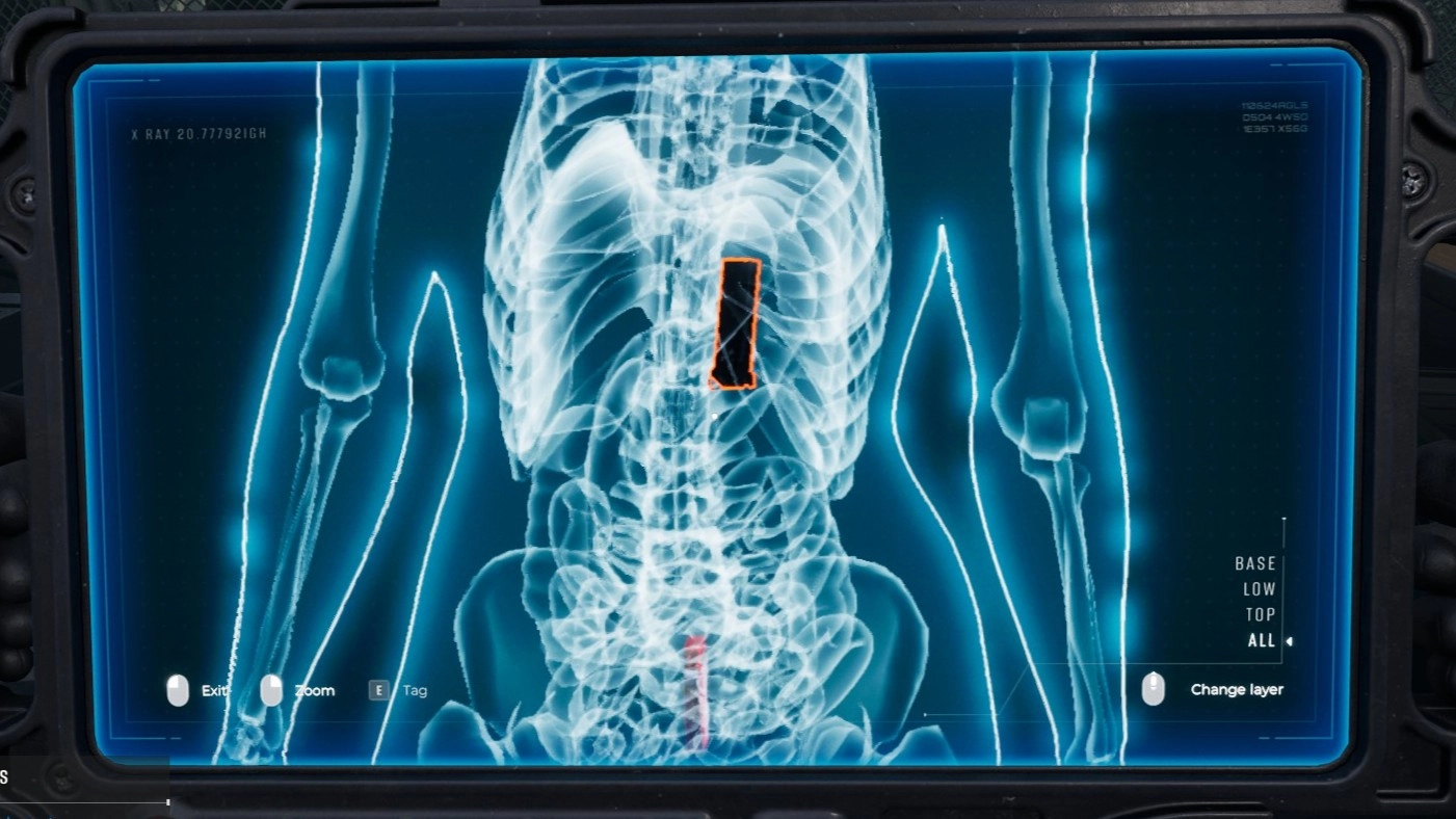 Some survivors are particularly sneaky about hiding their contraband items. To make sure they aren’t smuggling anything internally, you need to use the x-ray tool and switch down to the "all" layer. This layer doesn’t show any organs, so your view of contraband won’t be obscured. Be sure to check the back side of survivors too so you don't miss that one very obvious hiding place.