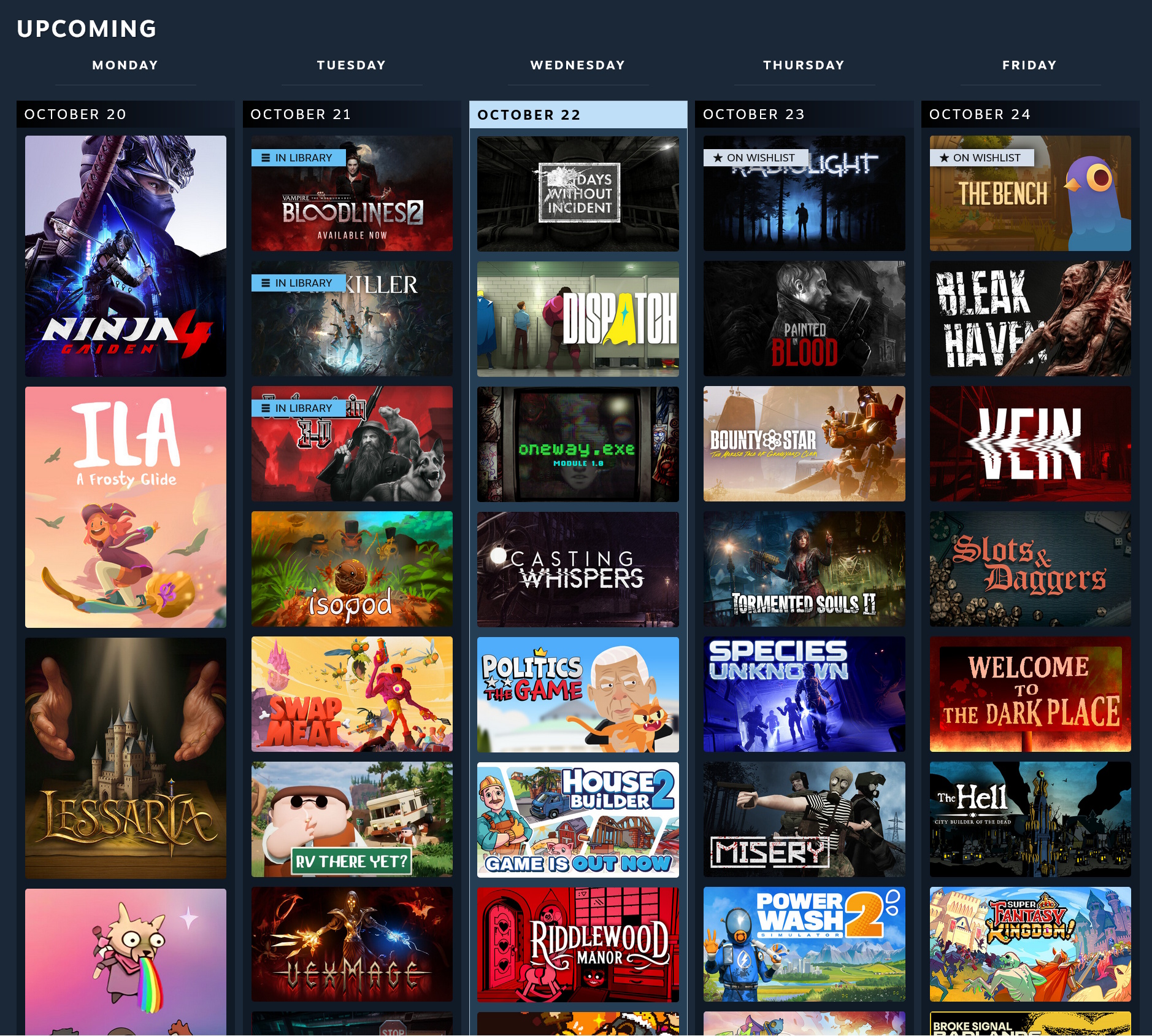I sometimes joke about Steam's over-reliance on algorithms, but the reality is that the sheer number of games flowing on Steam every week means human curation just isn't workable. Even browsing the store using Steam's many tools can feel overwhelming. This calendar is much simpler and easier to manage: At a glance I can see what I missed and what's on the way that's reasonably likely to be up my alley, without having to do anything but scroll. I like that a lot.