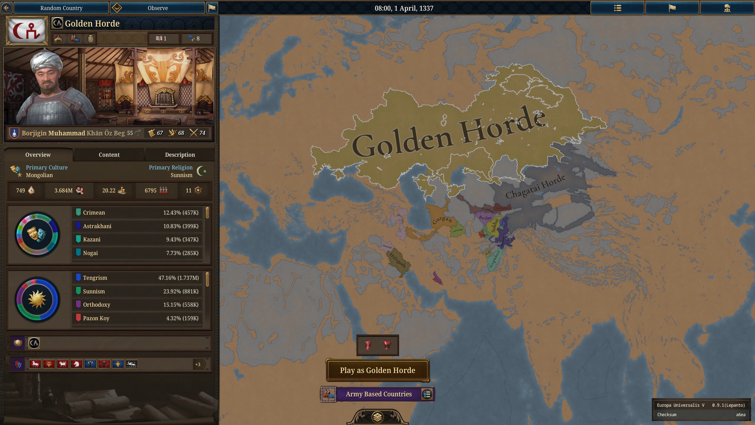To that end you choose your starting country, horde, trade league, empire, samurai clan, or the like, and manage its internal politics, wealth, diplomacy, and warfare in real time. Early parts of the game focus on centralization and control, building up the barest infrastructure that will let you enforce your laws and collect taxes in a way recognizable to modern people. As the game expands and time goes on new institutions appear and spread across the map, broadening your technology tree and your ability to develop and rule your country.