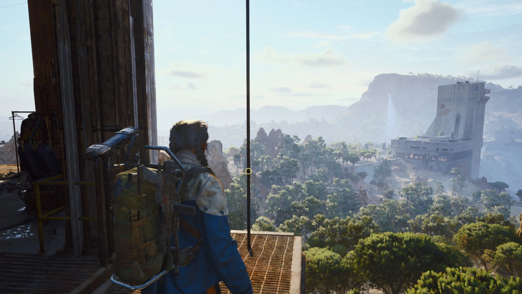 Now, you need to raise the flag above the outpost. Continue through into the main cylindrical room and go straight ahead out onto the exterior northeast balcony overlooking Red Lake. On the left side of this platform, you'll find a pole you can interact with to hoist the flag.