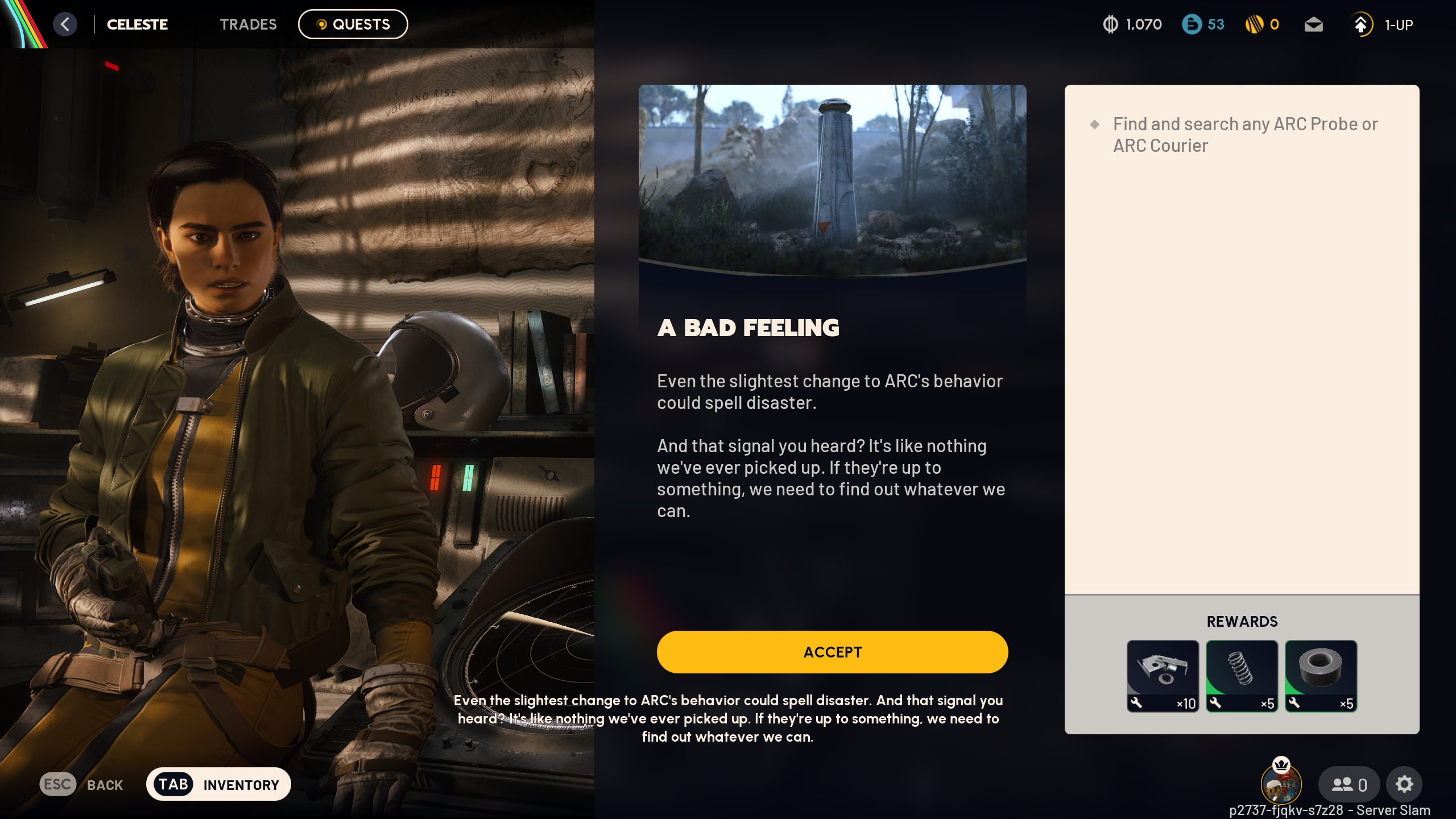 For completing the A Bad Feeling quest for Celeste, you'll earn ten Metal Parts, five Steel Springs, and five rolls of Duct Tape. Remember, even once you've finished the quest, it's worth keeping an eye out for ARC Probes and Couriers, as they can contain high-quality materials and gear, and they're simple enough to loot.