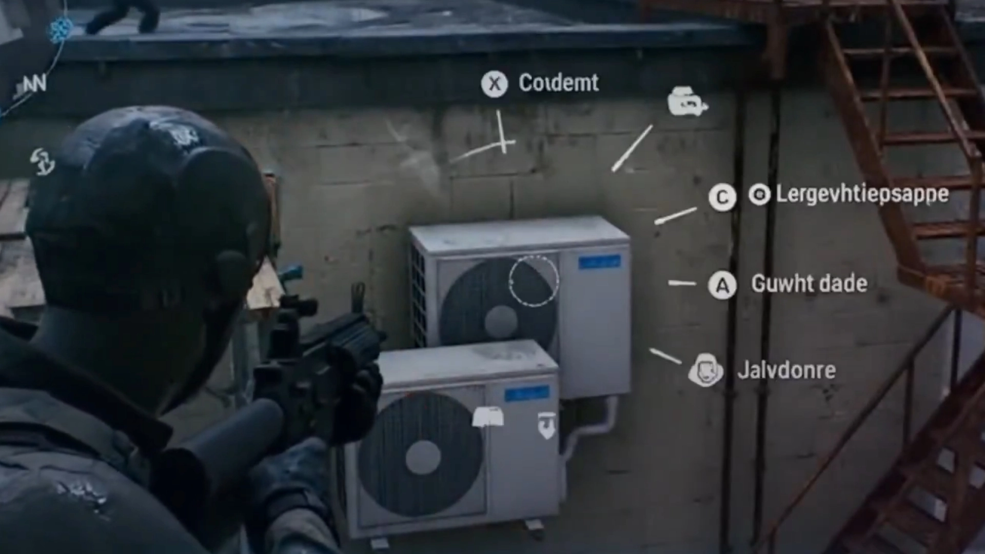 It's third person now. The subway exits onto a rooftop, where we do a little hop. There's an enemy across the roof from us. We fire a warning shot at him, but then turn to take aim at a pair of conjoined wall-mounted twin air conditioners. A radial menu appears, with options like "Condemt," "Lergevhtiepsappe," and "Guwht dade," which we ignore in favor of another choice for how to proceed. We choose to "take cover behind the HVAC," which we interpret as firing a shotgun blast at it. Our MP5 can do that now, I guess.