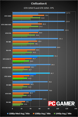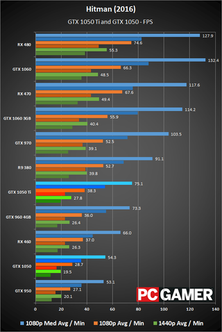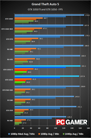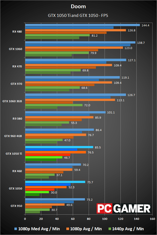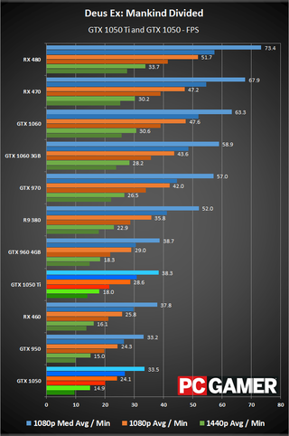 The GTX 1050 also beats the RX 460, which is probably a more important win—even when that card has twice as much VRAM. But that also depends on what games you're playing. Deus Ex, Doom, and Hitman all run better on the RX 460, thanks to DX12/Vulkan support, favoring AMD by 5-20 percent.
