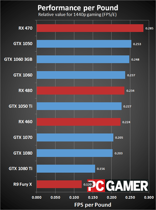 Nvidia’s other big introduction is the 1050 series, doing battle in AMD’s bread-and-butter mid-range market and proving a credible foe, beating both the RX 460 and the RX 480 slightly in value per dollar but losing to the RX 470. Nvidia’s mid-range hero, the 1060, brackets this category with superior performance at a sizeable cost markup on one end and a clever but compromised budget option on the other.