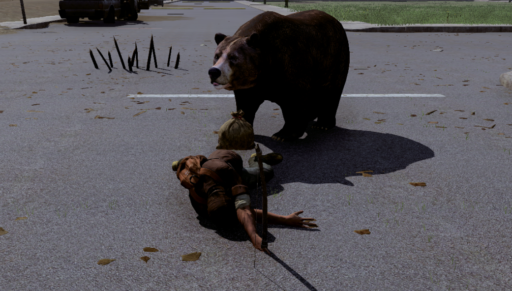 I spot a bear wandering around in the neighborhood, and put an arrow in his rump. He gives chase. I lead him over to my punji sticks to see if they hurt him. You can probably guess the answer. He runs right up to me and I instantly drop to the ground, dead. My precious bag of loot lands next to my body.