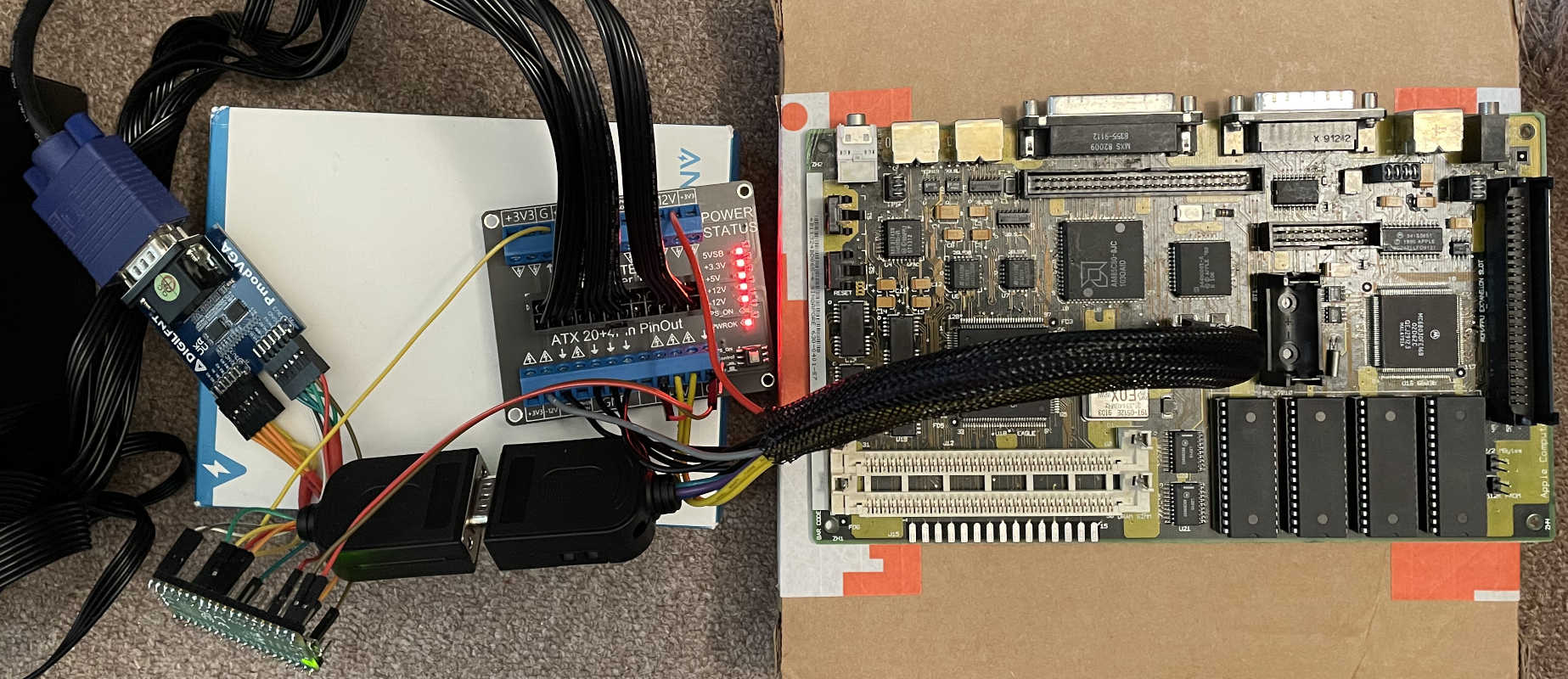 After coming up with this theory, Brown decided to buy a used Mac Classic 2, pull out its logic board, and clean it up to restore it to working order. I love this photo of his hacked-together Classic 2 that uses a modern ATX power supply and a Raspberry Pi to output the video signal to a capture device so he could take clean screenshots.