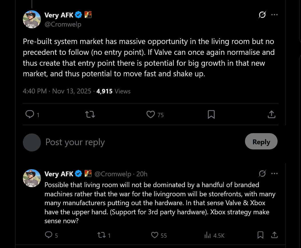 And what that has the potential to do, he continued, is shift "the war for the living room" from a battle between a few branded bits of hardware to one between digital storefronts—that is, numerous hardware manufacturers putting out a range of machines to run a handful of competing storefronts like Steam. "In that sense Valve & Xbox have the upper hand. (Support for 3rd party hardware)," Douse concluded. "Xbox strategy make sense now?"