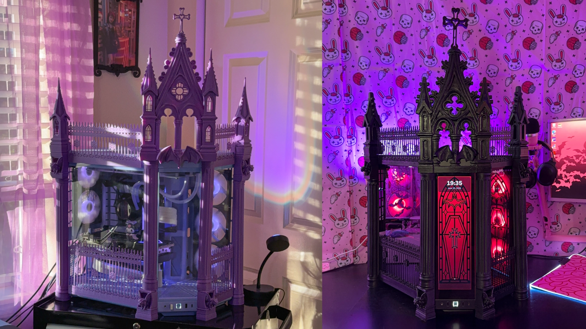 Zoë had already shared some of her earlier PC projects online, including this delectable 'Strawberry Milk' build, as well as a custom lavender 'Dream PC' for Brandon. Builds like this drew a lot of attention to Zombie Tech Gaming in its early days, though camera man Brandon also highlights, "I think what really hit it off was we were one of [very few businesses] that offer, like, full customization. On top of the cathedral kits, we were offering 3D modelling and printing."