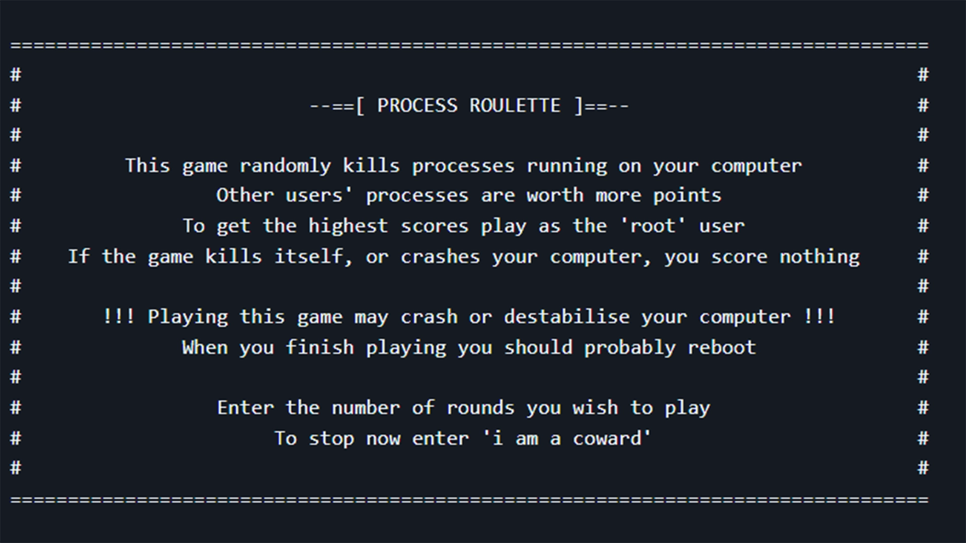 I also found another application created 10 years ago, born from a tweet posted by user Jamis. Further to the mental damage I just received upon realising 2016 was ten years ago, the application, also called process roulette, encourages a group of players to hop onto a virtual machine to play. This is a slightly more well-defined game than the others, with a "croupier" acting as the game's referee, and a 'controller' that actually runs the game. And you're not killing your own PC to play, though you could.