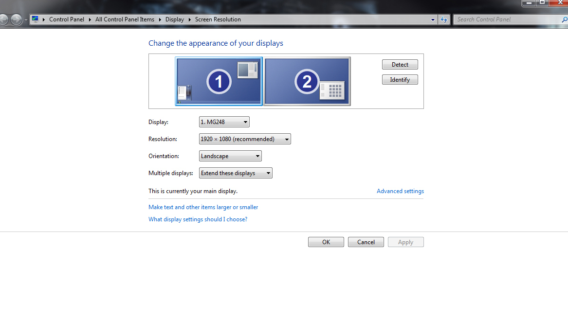 If you’re unsure which monitor is number one and number two based on your setup, click ‘identify.’ Two huge numbers will appear on each of your monitors, respectively, for three seconds. This comes in handy if you have identical monitors and don’t feel like following their cables back to your PC to figure out which is which.