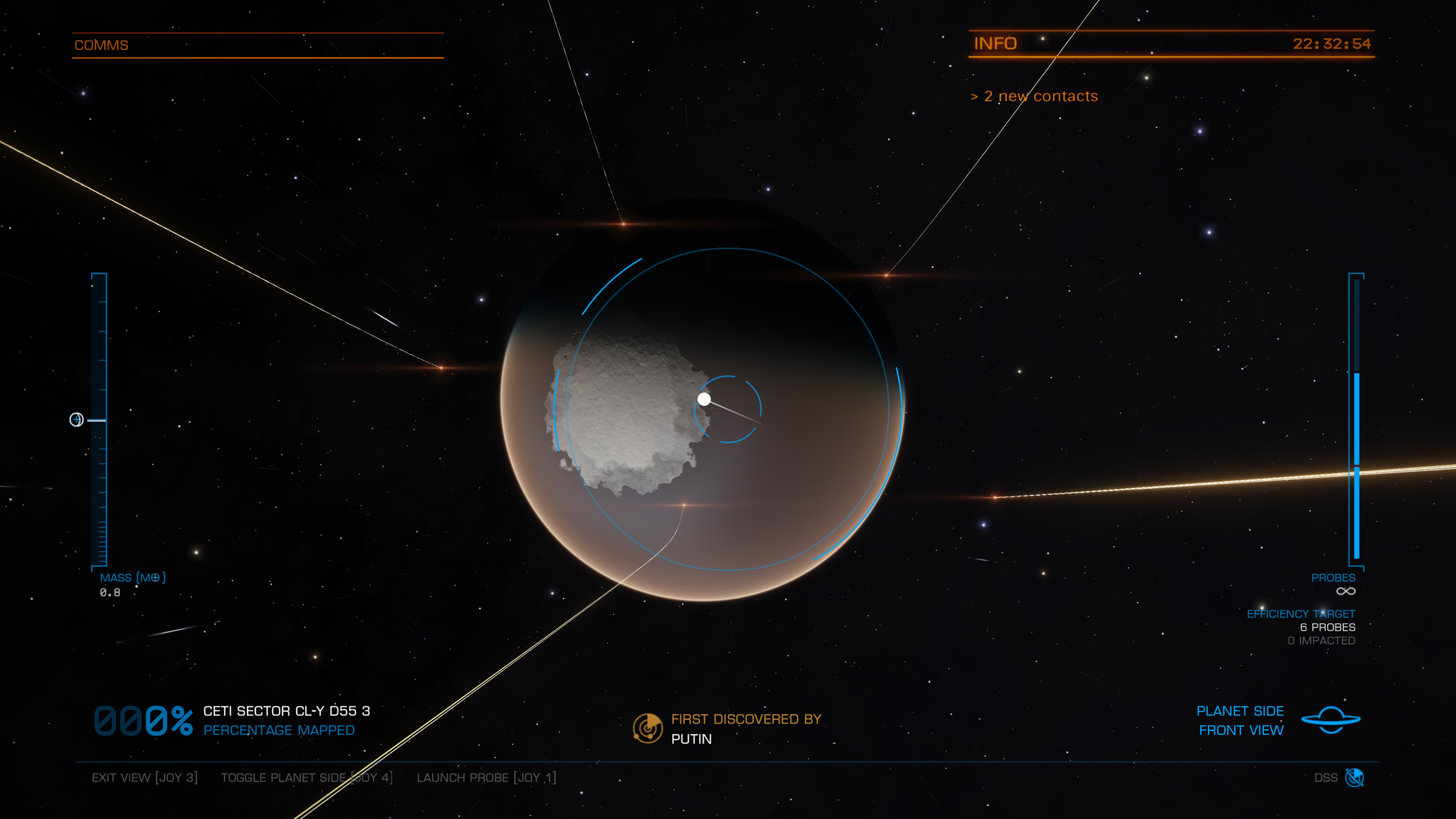 There's a nice skill-based element too. You can haphazardly fling dozens of probes at a body until your mapping percentage reaches 100. But every planet has an efficiency target, and if you hit that—say, mapping a whole planet with six or fewer probes—you get a credit bonus.