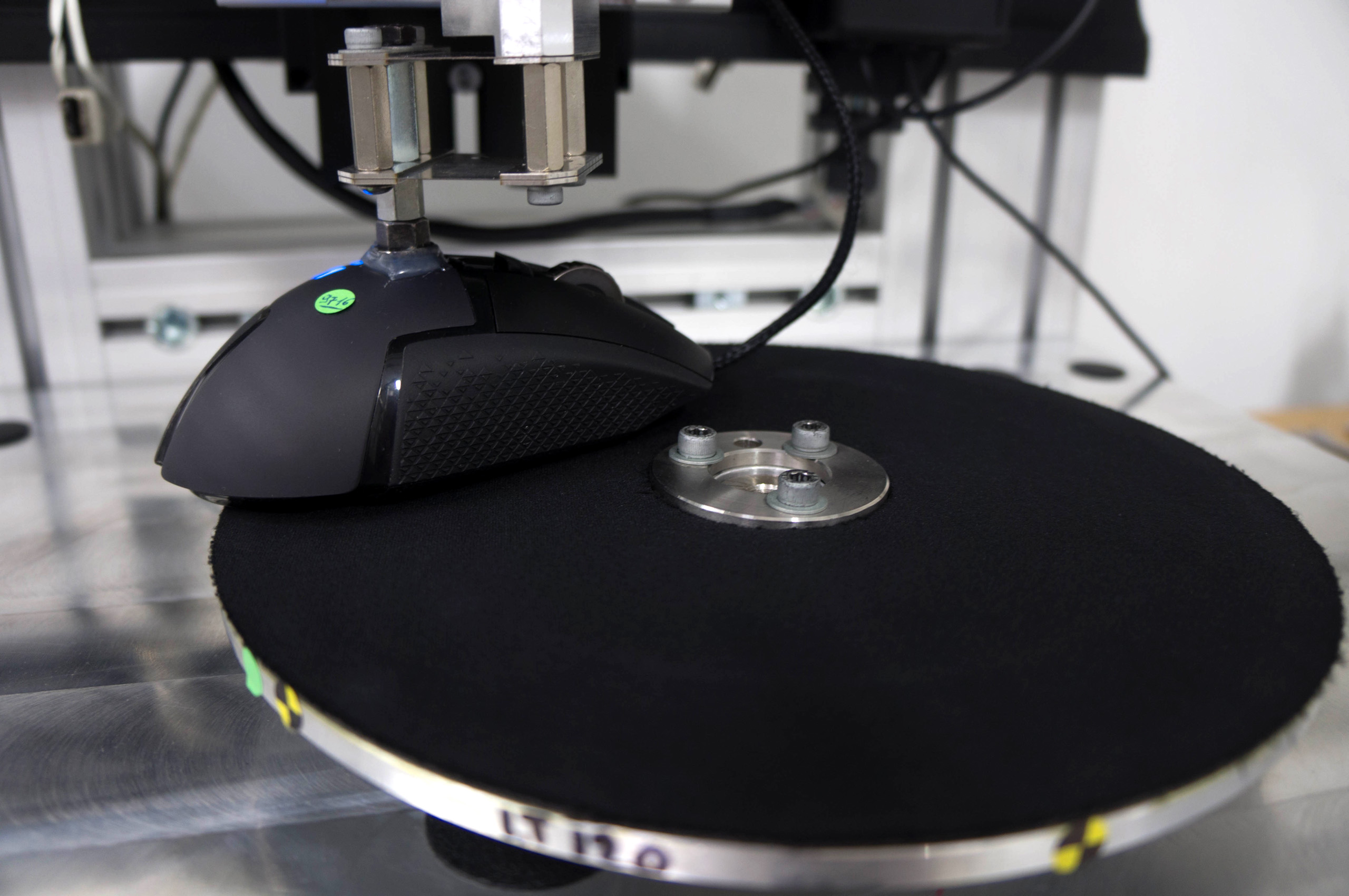 Chris Pate, referring to the test machine: "This specific mouse was collected from a user who was experiencing what he felt to be inaccuracy or acceleration. So I contacted him, got the mouse back, got him a different one, shipped it off to François to validate. Because it’s not that we’re trying to prove that anybody’s wrong. We want to make sure that everything we do meets the standards that we’ve set. So in the event that there was something wrong with the mouse, we collected it to make sure, and we validated that it actually does perform as we’ve specified. We narrowed it down to one of two things. Either the USB port that he was using, or the fact that he was removing the weight door to reduce the weight because he wanted a lighter mouse, and if you remove the weight door it removes one of the feet, and you can actually pick the sensor up a little bit when you’re swiping it."
