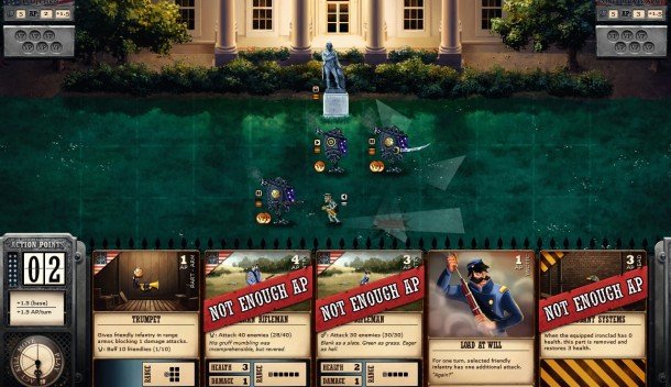 Ironclad Tactics takes a bit of explaining. It's a card-based strategy game that runs in realtime, where armies of retro robots march across a grid-based map as players spend action points on the cards that arm them, move them, repair them, and introduce new units to the fray.