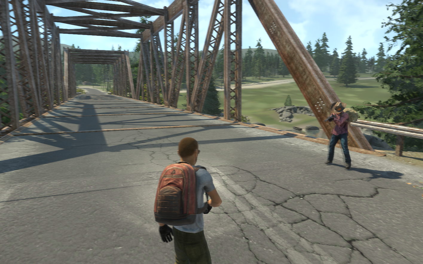 Later, while crossing a bridge, I spot a player with a cowboy hat. He's pointing a rifle at me. I try to talk to him over the mic but he doesn't answer. I take out my flashlight and click it on and off, as if he might know Morse code, even though I don't know Morse code. I still get no response from him. I figure he's either out of ammo, or is checking to see if I'm alone before shooting me.