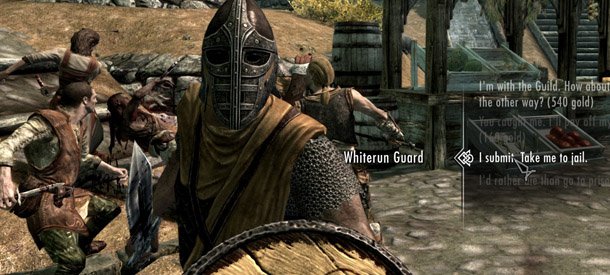 The Jarl has an honorable, slow-motion death as I hack at his sleeping body. The guards run over to arrest me, and I try telling them that I'd rather die than go to prison, anticipating a fun Blink-filled escape from Whiterun. Unfortunately, Skyrim does that thing where it doesn't select the line of dialogue I'm pointing at, so I accidentally bribe the guards and they peacefully escort me to the front door. Oh well.