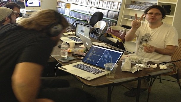 By 7 PM, the developers had formed into groups, assigned duties and begun coding. Some pulled out sketch pads, others, audio equipment or drawing tablets, and started downloading resources as needed and requesting art, music and code from team members collaborating from home.