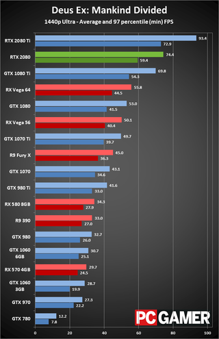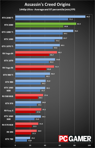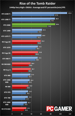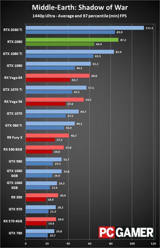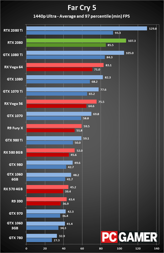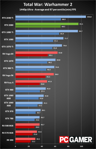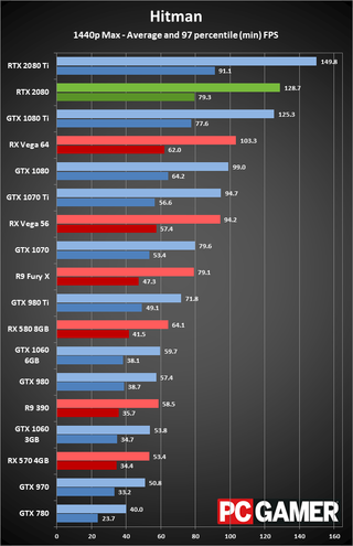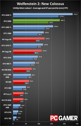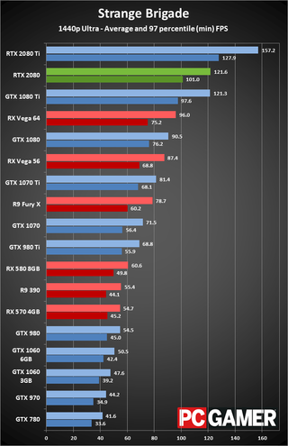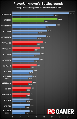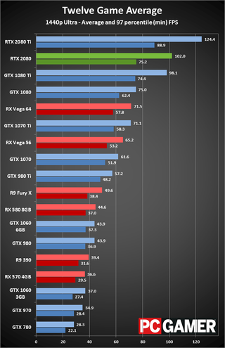 Dropping to 1440p doesn't really change things much. The GeForce RTX 2080 FE is 4 percent faster than the GTX 1080 Ti, and 36 percent faster than the GTX 1080. If you have a 144Hz G-Sync display, you're in the sweet spot of around 100fps. However, you honestly wouldn't notice the difference between 1080 Ti and 2080 in the current crop of games. That might change once the ray tracing and DLSS games start arriving, but right now it's a wash.
