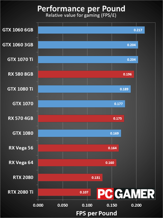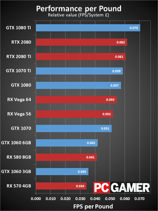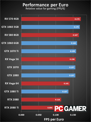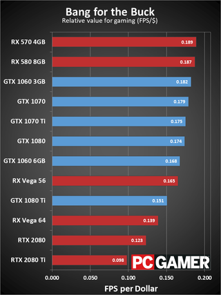How can a graphics card be both the best and worst value? It's all in the perspective, and that perspective includes the current crop of tested games—test again in six months using games with ray tracing or some other new feature and the rankings could change again. You should also factor in your current graphics card when considering value, as upgrading from a GTX 1070 to an RTX 2080 means the potential gains are even smaller. Put another way, I don't feel either of these value charts are an entirely valid representation of the market, because there are dozens of contributing factors, but they're at least an interesting data point to consider.