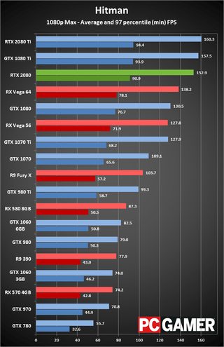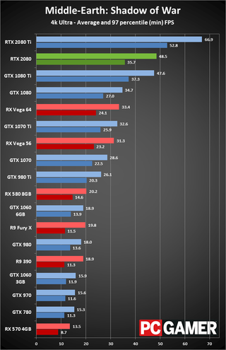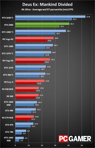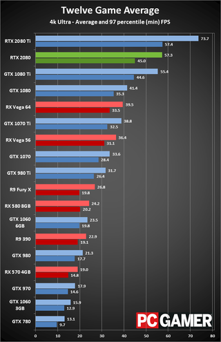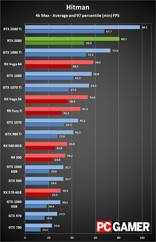 Starting at 4k, there was hope that the GeForce RTX 2080 would be significantly faster than the RTX 1080 Ti. That clearly isn't the case, at least not on existing games. Hitman running DX12, and Wolfenstein 2 using the Vulkan API, end up being the only games to see double digit percentage gains at 4k. Most other games are a wash, and overall with the twelve tested games, GeForce RTX 2080 leads the GTX 1080 Ti by just 3 percent.