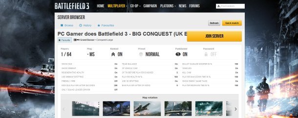 PC Gamer UK has a Battlefield 3 server! It supports 64 players! And fun! To get involved, just click here , or search for "PC Gamer" in the server browser. It's a Conquest-only affair at present, with every map enabled apart from Operation Metro (because everyone hates Operation Metro). The server is based in the UK and hosted by the lovely guys at Multiplay .