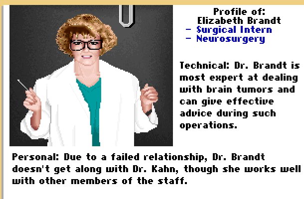 Like most games of this era, Life and Death 2 takes the very reasonable stance that tutorials are for pussies. Your introduction to the game consists entirely of a quick description of the rooms available in the hospital, and then you're kicked out and assigned your first patient. You can go back to class and page through endless tedious nonsense about saline drips and cerebrospinal fluid, but who cares about that next to the grander concern of saving lives! I decided I'd rely on good old gut instinct, then remembered I was playing the sequel, and decided to swap that for skull instinct instead.