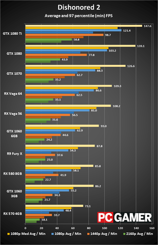 What I'm left with is 15 games, released between 2015 and 2017. There are multiple AMD Gaming Evolved titles (Ashes, BF1, Civ6, DXMD, Hitman, and TW: Warhammer) and also quite a few Nvidia TWIMTBP games (Division, GR: Wildlands, RotTR, and some technologies in Dishonored 2 and Fallout 4). There are also DX12-enabled games, quite a few of which I test in DX12 on all GPUs. The two DX12 games that I don't test using DX12 on Nvidia hardware are Battlefield 1 (slightly worse performance) and Warhammer (significantly worse performance), but Ashes, Deus Ex, Division, Hitman, and Tomb Raider are all tested in DX12 mode—it doesn't necessarily help Nvidia in many cases, but it doesn't substantially hurt Nvidia either. Here are the results of testing: