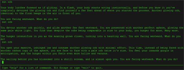 A few weeks ago, Zoe Quinn (of Depression Quest fame) lanched Tidbytes, a webcomic-style site where she aims to release a new short game every couple of weeks. The first was Win RL Stine's Money, a timed quiz themed around the author of the Goosebumps series, while the latest is Clone, a short piece of interactive fiction that made me quite hungry. True to the name, Clone is apparently copycatting a pre-existing game, though I'm too full of orbs to realise what it's ripping off.