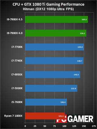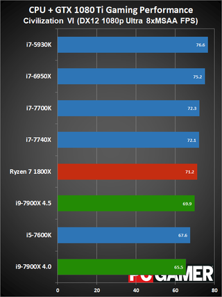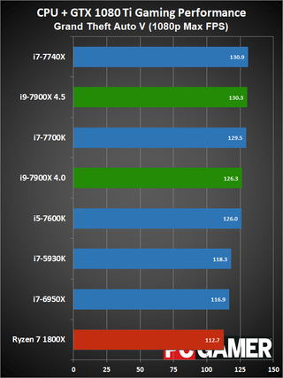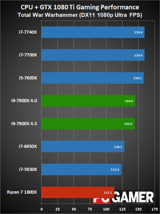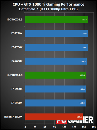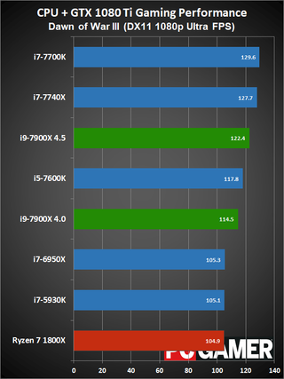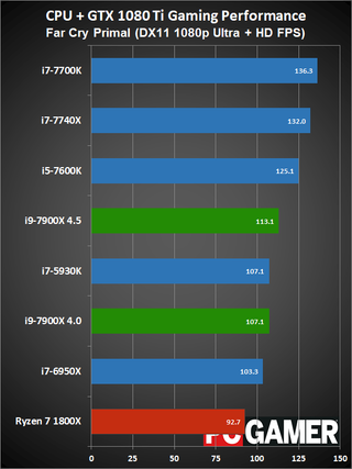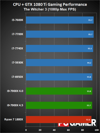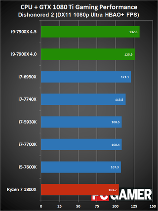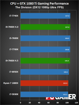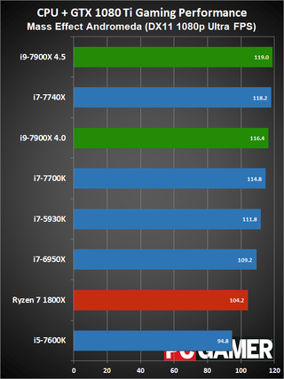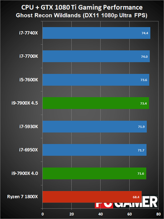Moving on to gaming performance, at 4.5GHz the i9-7900X comes in just ahead of the i7-7740X—which is basically tied with the i7-7700K. At 4.0GHz, however, it falls a few percent below the 7700K, but still beats the 6950X and 7600K. The i9-7900X is definitely fast enough for gaming, but the extra cores aren't always very useful.